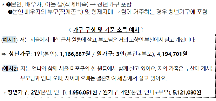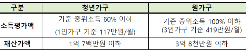 청년가구의 경우 기준중위소득이 60% 이하여야 하며 원가구는 기준중위소득 100%이하여야 합니다.
