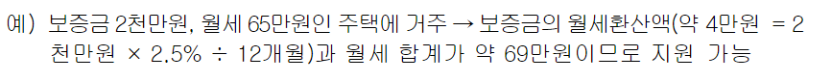보증금이 5천만원을 초과한다면 월세 지원을 받을 수 없지만 월세가 60만원을 초과하는 경우에 월세와 보증금의 월세환산액을 합한 금액이 70만원 이하 일 경우 지원 가능합니다.