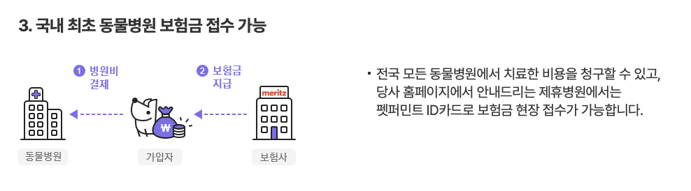 - 전국 모든 동물병원에서 이용이 가능하고, ID카드 하나로 보험금 현장 접수가 가능합니다. 펫퍼민트는 병원을 제한하지 않고, 전국 어디서나 이용할 수 있습니다. 또한, 펫퍼민트 등록증만 보여주면 되는 간편한 접수 방법을 제공합니다. 메리츠화재 자체에서 안내해주는 병원에 가시면 ID카드 하나로 보험금 현장 접수가 바로 가능하게 됩니다. 이는 병원에서 복잡한 서류 작성이나 청구 절차를 거치지 않아도 되어, 시간과 노력을 절약할 수 있습니다.