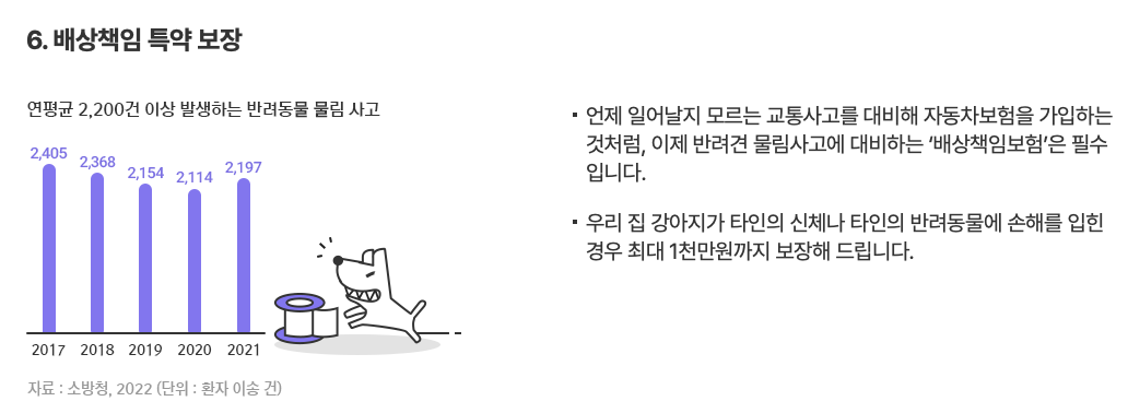 - 애완동물이 타인에게 피해를 줬을 때 법적 책임을 지게 되는 경우 보상해줍니다.