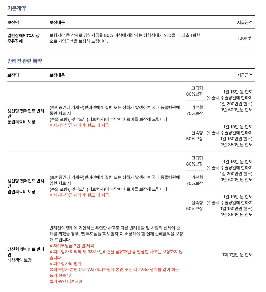 - 사고치료비: 반려동물이 사고로 인해 수의사에게 진료를 받거나 입원을 할 경우, 치료비를 보장해줍니다. 보장금액은 연간 1천만원으로, 자기부담금은 10%입니다.