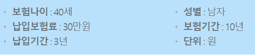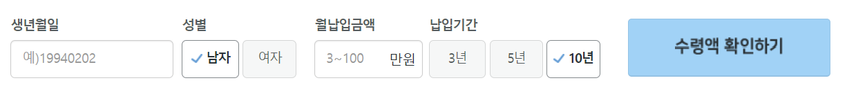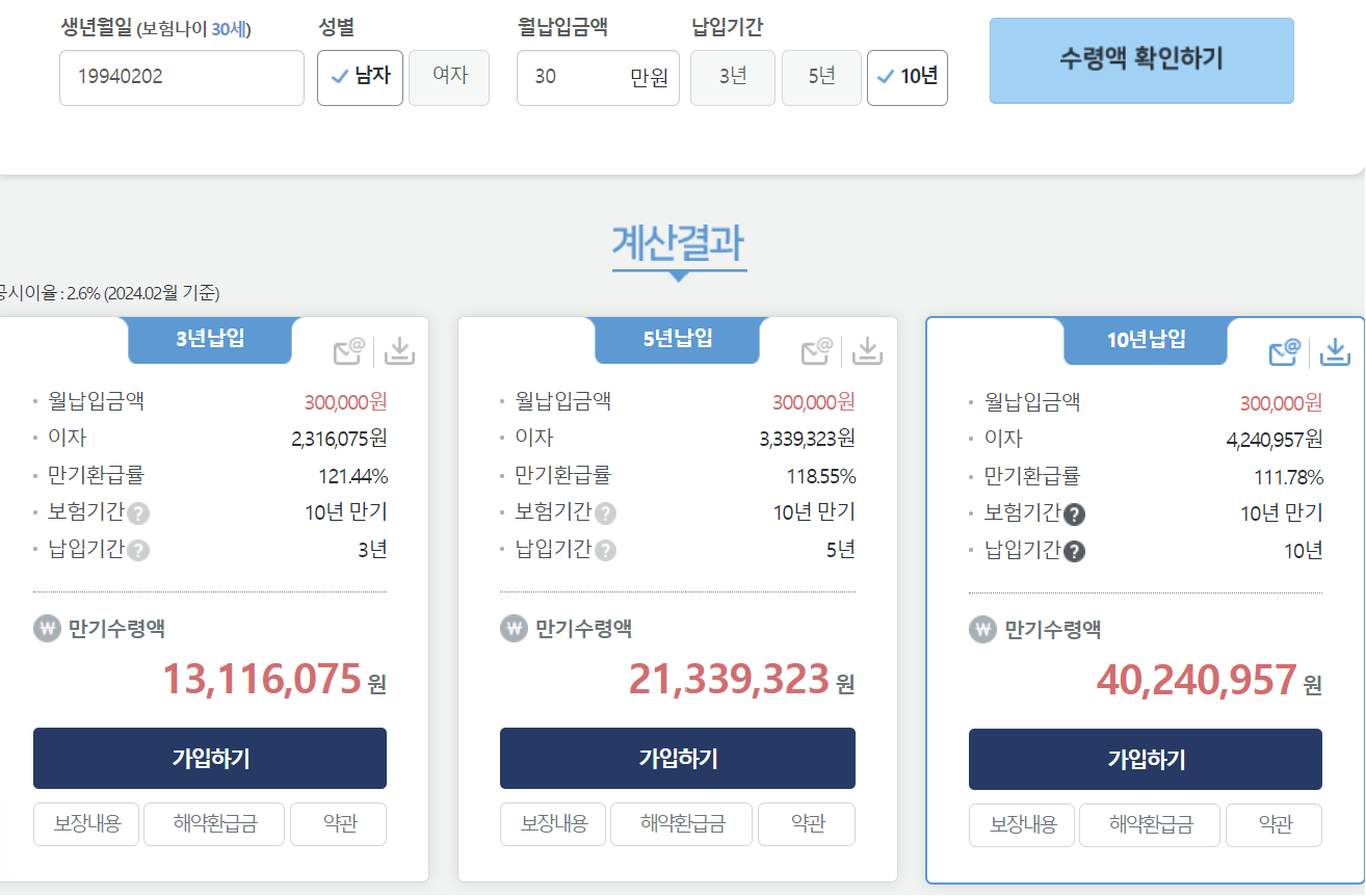 30대 남자 30만원 납입, 납입기간 10년 시 수령액을 계산해줍니다.