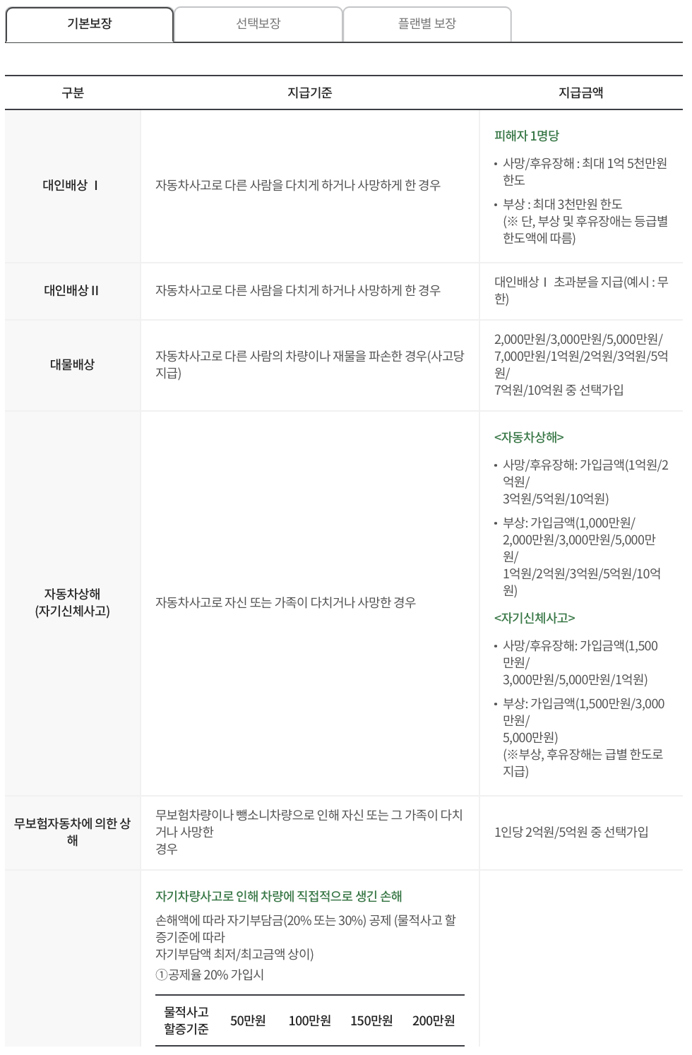 - 타인배상: 자동차 운전 중 타인의 재산이나 신체에 손해를 입힌 경우, 그 손해를 배상합니다. 보장 금액은 최대 2억원까지 가능하며, 선택적으로 5억원까지 높일 수 있습니다.