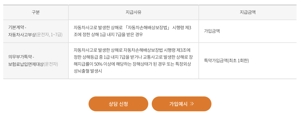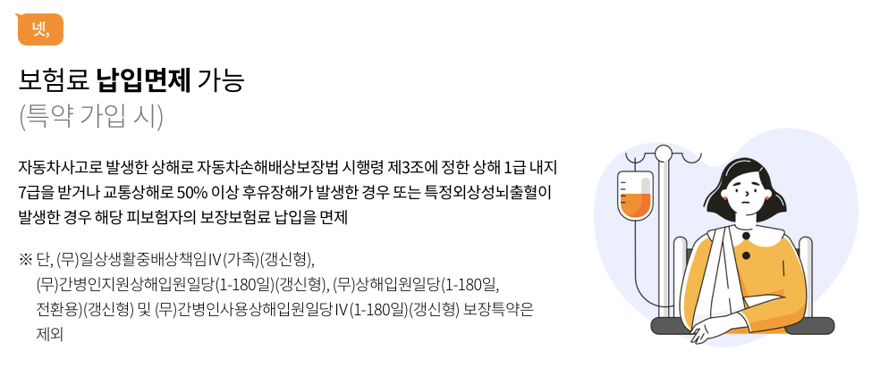 - 납입면제: 자동차사고로 인해 운전자가 부상 또는 사망한 경우, 보험료 납입을 면제합니다.