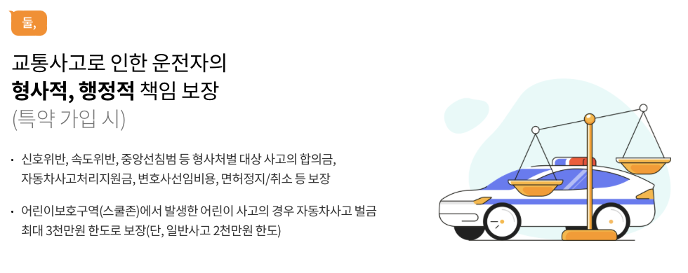 - 자동차사고 처리 지원금: 자동차사고로 인한 형사합의금, 벌금, 변호사 선임비용 등을 보장합니다.