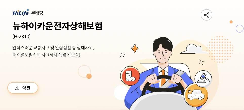 현대해상 뉴하이카운전자상해보험 무배당은 교통사고 및 일상생활 중 상해사고, 퍼스널모빌리티 사고까지 폭넓게 보장하는 운전자보험입니다.