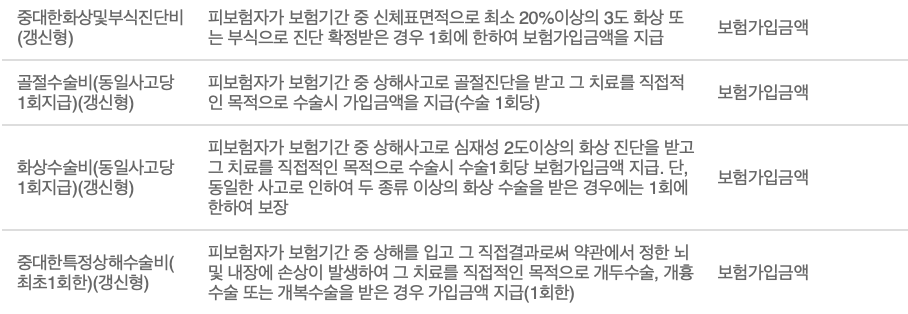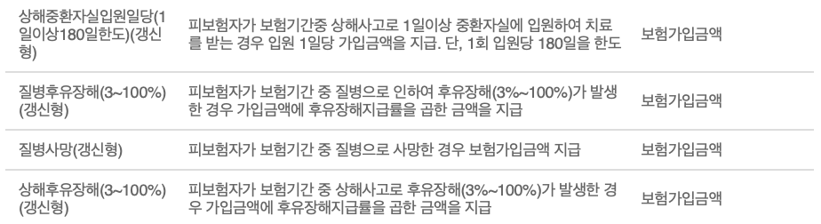 - 다양한 질병과 사고에 대비할 수 있습니다. 암, 뇌졸중, 심장마비, 중증화상 등 16가지 중증질병과 사망, 상해, 장해 등에 대해 보장해줍니다. 또한, 입원비, 수술비, 특별진단비 등도 지급해줍니다.