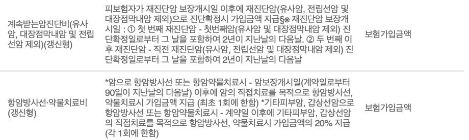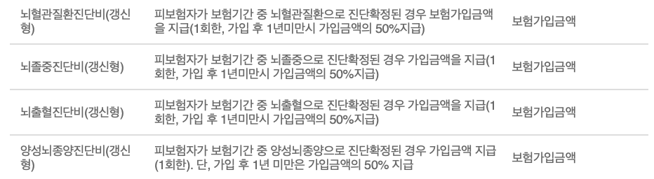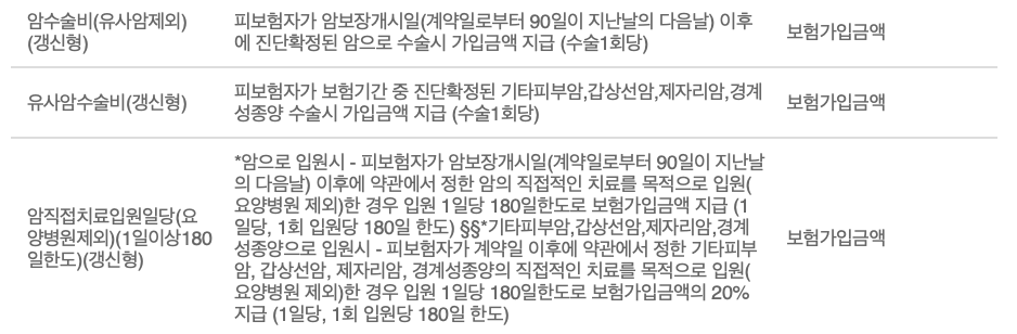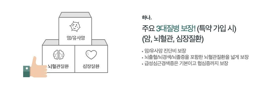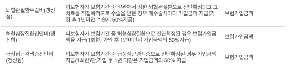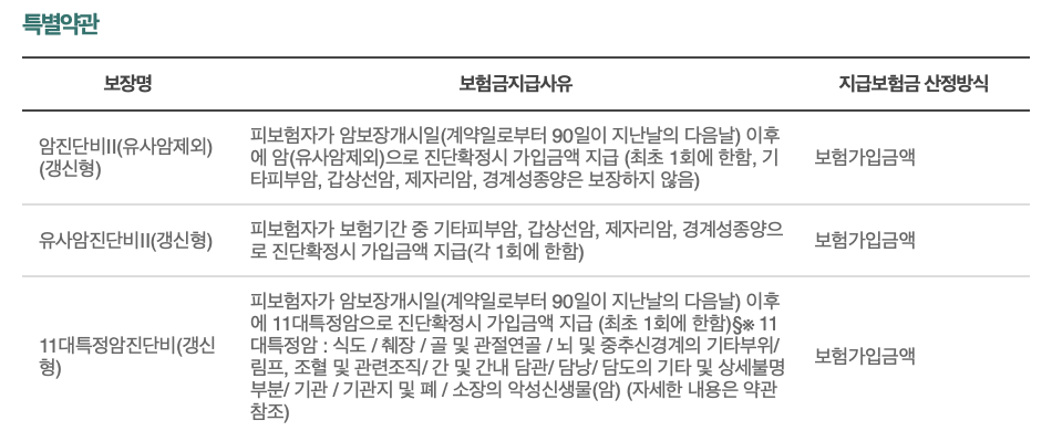- 암진단비, 유사암진단비, 뇌혈관질환진단비, 뇌졸중진단비, 허혈심장질환진단비, 급성심근경색증진단비 등 다양한 진단비를 보장합니다. 유사암은 기타피부암, 갑상선암, 제자리암, 경계성종양을 말합니다.