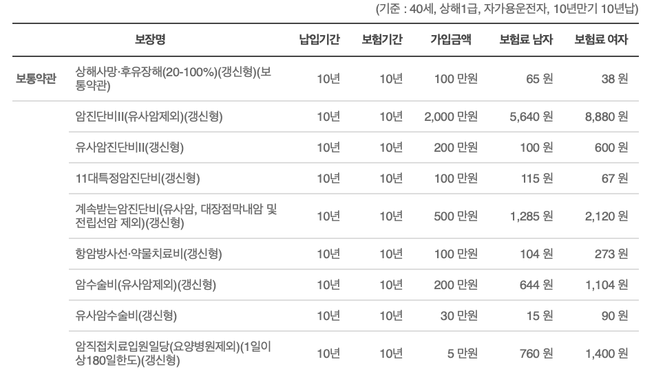 - 보험료는 나이, 성별, 보장담보, 가입금액에 따라 달라집니다. 예를 들어 40세 남자의 경우 월 80,000원, 40세 여자의 경우 월 60,000원의 보험료를 내야합니다.