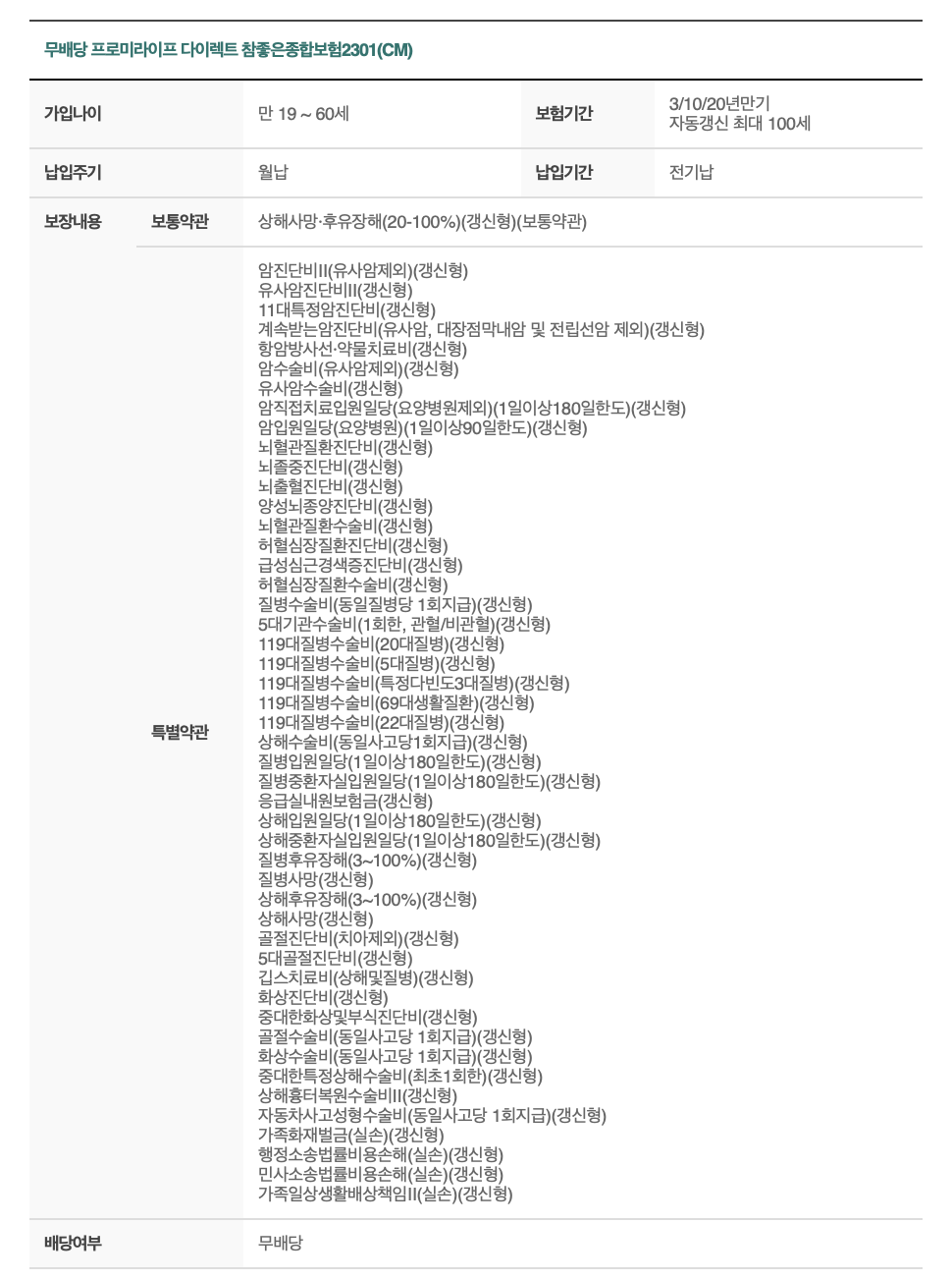 DB손해보험 참좋은건강종합보험은 무배당 프로미라이프 참좋은행복더블플러스종합보험으로, 주요 3대 질병 (암, 뇌혈관, 심장질환)을 보장하는 것은 물론이고, 진단/입원/수술비 보장과 상해/운전 비용 (배상관련)을 보장하는 특징이 있습니다. 이 글에서는 이 상품의 장단점에 대해 알아보겠습니다.