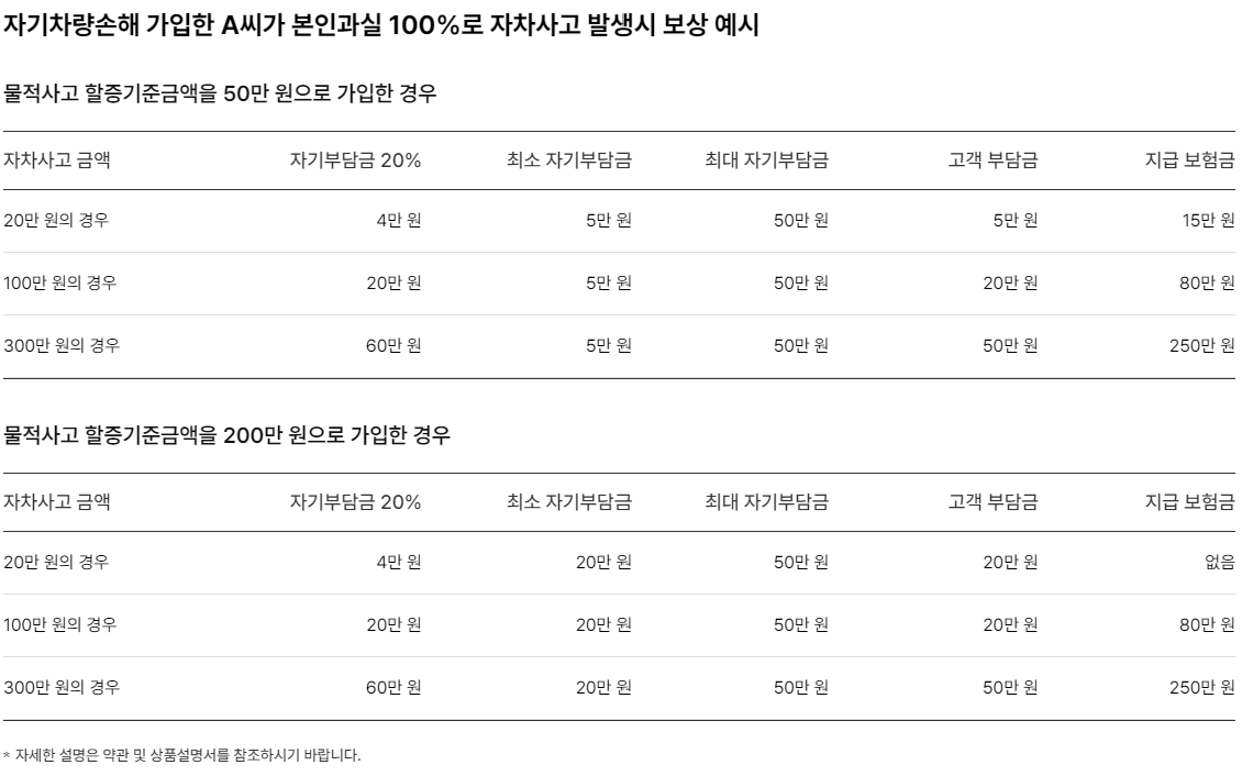 - 자차사고 발생시 자기차량손해 보험금의 20%를 피보험자가 부담하셔야 합니다. 단, 피보험자가 부담하는 최대 금액은 사고 건당 50만 원이며, 최고금액은 자기부담금 비율에 따라 달라집니다. (50~200만원)