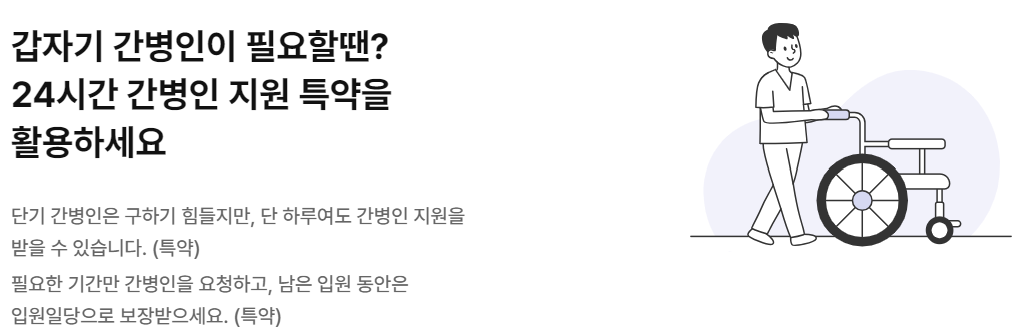 | 갱신형 간병인 입원일당(Ⅱ)(1일 이상 180일 한도) | 일반상해 또는 질병으로 입원하여 치료를 받을 때 입원 1일마다 간병인을 지원하거나 간병인을 지원받지 않으면 최초 입원일부터 입원 1일마다 입원일당 가입금액 지급, 단 간호간병통합서비스 사용시 입원일당 가입금액의 2배 지급 (1회 입원당 180일한도, 간병인을 지원받으면 입원일당 및 간호간병통합서비스 사용 입원일당을 지급하지 않음) |