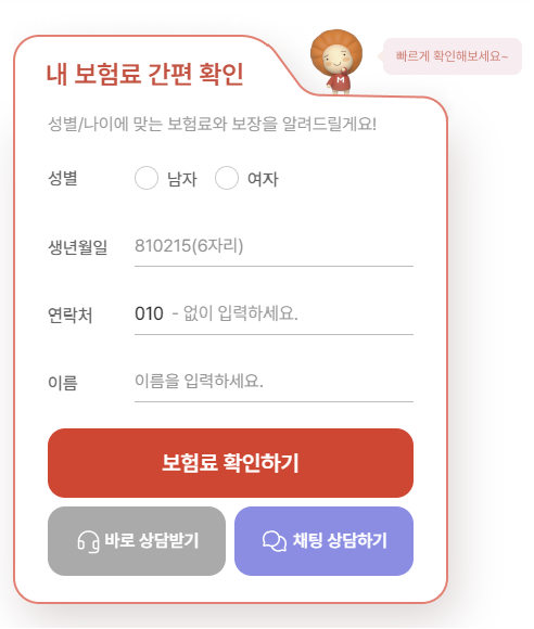 성별, 생년월일, 연락처, 이름을 입력 후 보험료 확인하기를 클릭합니다.