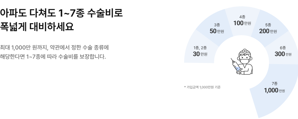 | 갱신형 수술비(1~7종, 연간 3회한[질병]) | 질병의 직접적인 치료를 목적으로 약관에서 정한 수술을 받을 경우 ※ 1회의 입원당 또는 1회의 통원당 1회의 수술에 한하여 보장하며, 하나의 수술 코드당 연간 3회에 한하여 보장 ※ 동일한 수술코드에 대한 보험금 지급은 직전 퇴원/통원일의 다음날부터 다음 입원일 또는 통원일까지 30일이 경과해야 함 |