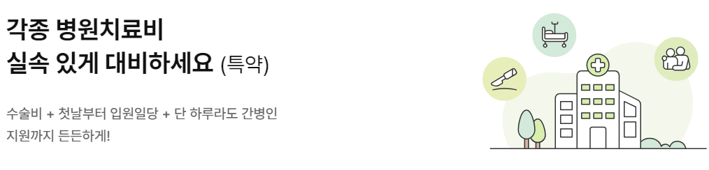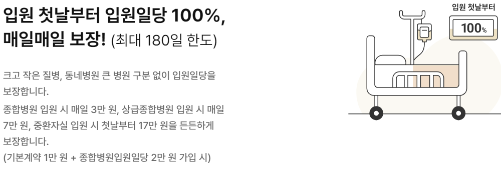 | 갱신형 종합병원 입원일당 (1일 이상 180일 한도) | 일반 상해 또는 질병으로 종합병원에 입원 시 최초 입원일로부터 입원 1일당 (1회 입원당 180일 한도) |