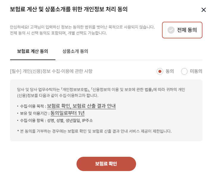 상품소개를 위한 개인정보 처리는 동의체크 안하셔도 됩니다. > 보험료 확인하기 클릭 그럼 아래와 같이 보험료가 조회됩니다.