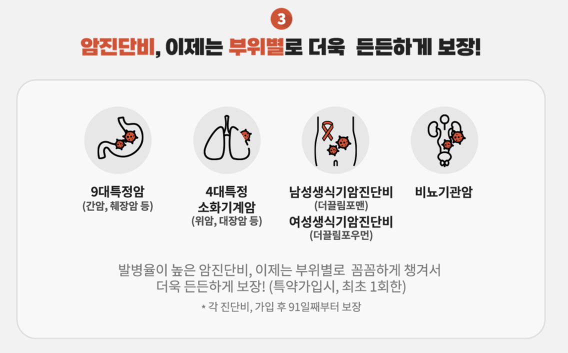 - 암수술비, 암입원비, 암통원치료비 등 암 관련 보장을 강화했습니다.