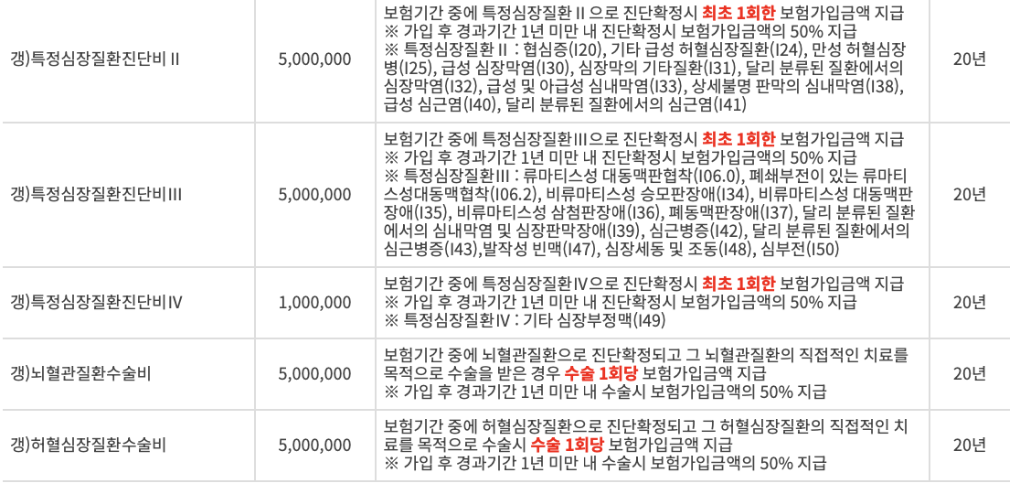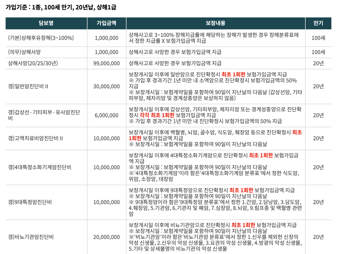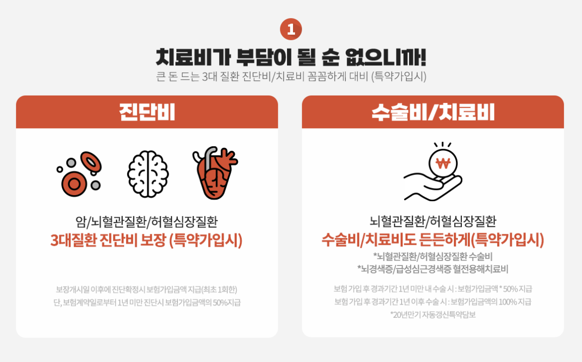 - 특약: 암진단비 1억원 ~ 3억원, 뇌졸중진단비 1억원 ~ 3억원, 급성심근경색증진단비 1억원 ~ 3억원, 3대질환진단비 1억원 ~ 3억원, 암수술비 500만원 ~ 3,000만원, 뇌졸중수술비 500만원 ~ 3,000만원, 급성심근경색증수술비 500만원 ~ 3,000만원