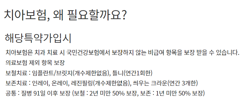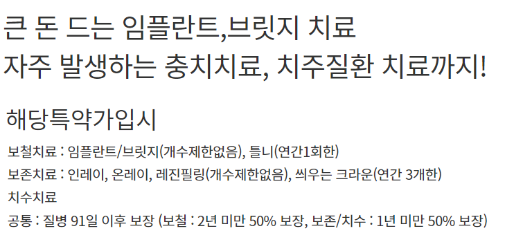 | ※ 감액기간 : 치아관련 질병을 원인으로 하는 경우 최초 가입일로부터 2년 미만 진단 시 지급금액의 50%를 지급함 ※ 보장개시일 - 최초 : 상해(보험계약일), 질병(보험계약일로부터 그날을 포함하여 90일이 지난 다음날) - 갱신 : 이 특약의 갱신일 ※ 치아수복물 또는 치아보철물을 수리, 복구, 대체하는 경우, 미용상의 치료를 한 경우에는 보상하지 않습니다. 매복치,매몰치,사랑니에 대한 치아치료, 부정치열을 교정하기 위하여 영구치를 발거, 치열교정 준비 등 다른 치과 치료를 위하여 임시 치과 치료를 한 경우는 보상에서 제외됩니다. |