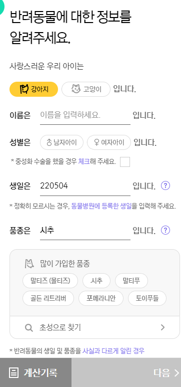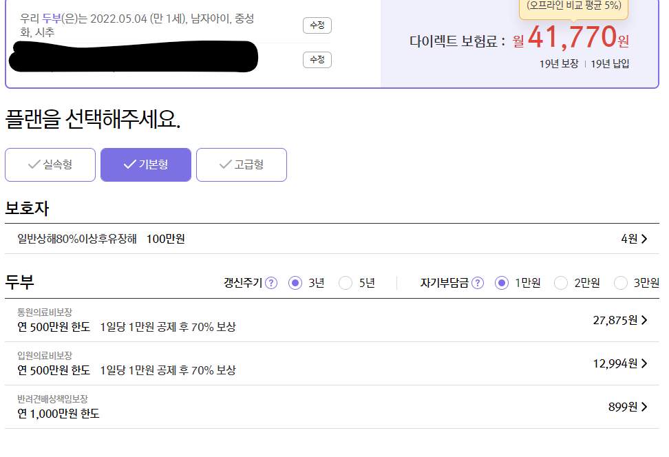 보험료는 강아지마다, 보호자 정보 갱신 주기, 자기부담금 설정, 플랜 등 여러 조건에 따라 다르므로 직접 조회해보시기 바랍니다.