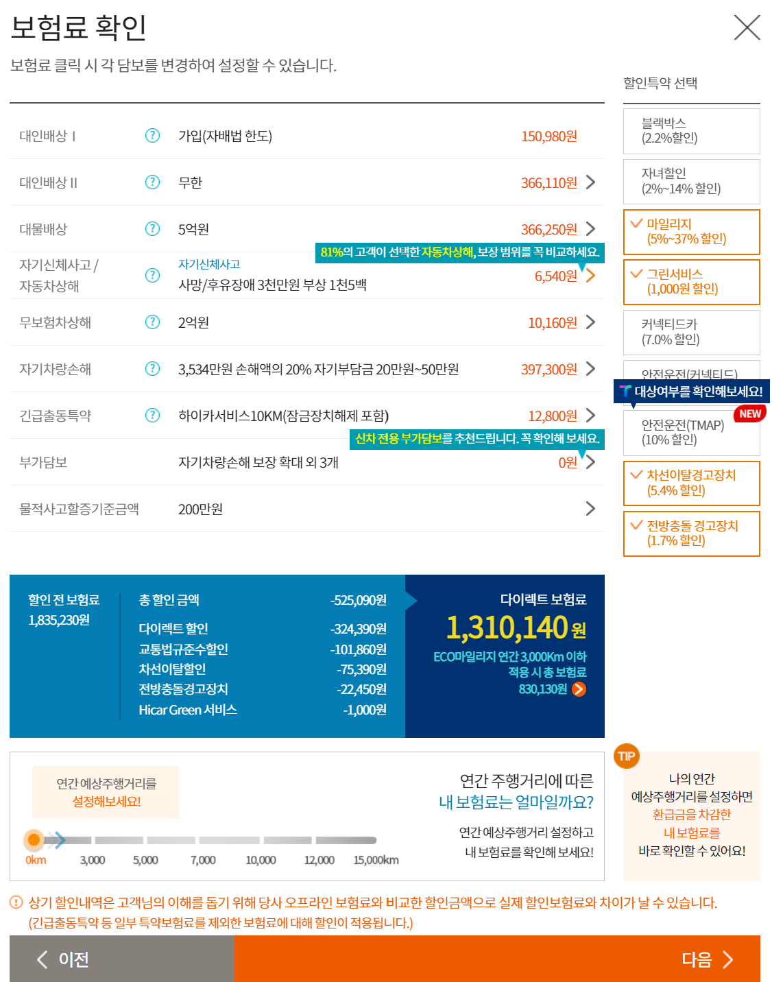 할인 받을 수 있는 특약을 선택한 뒤 보험료 확인을 누르면 다음과 같이 보험료가 계산됩니다.