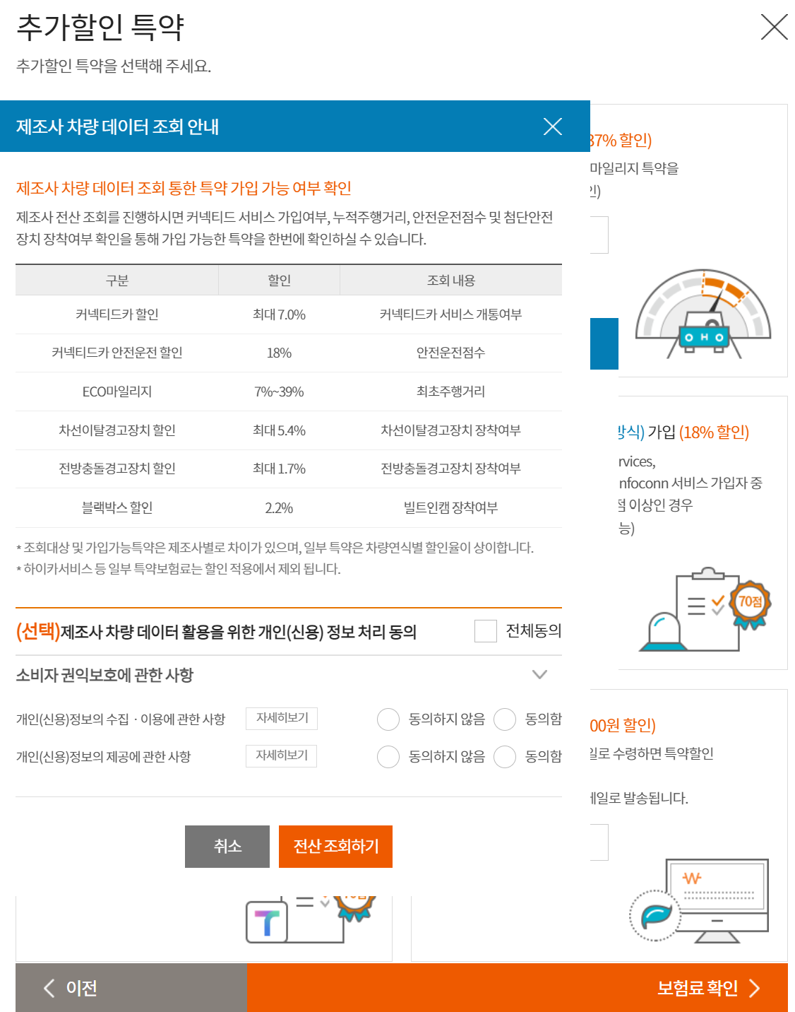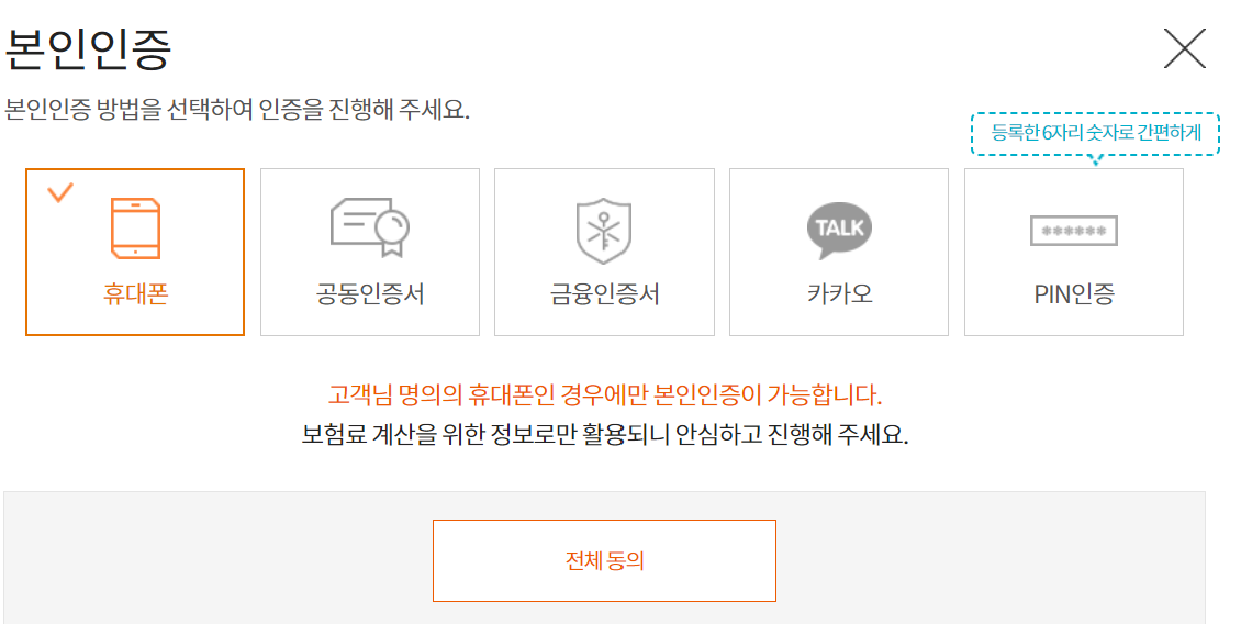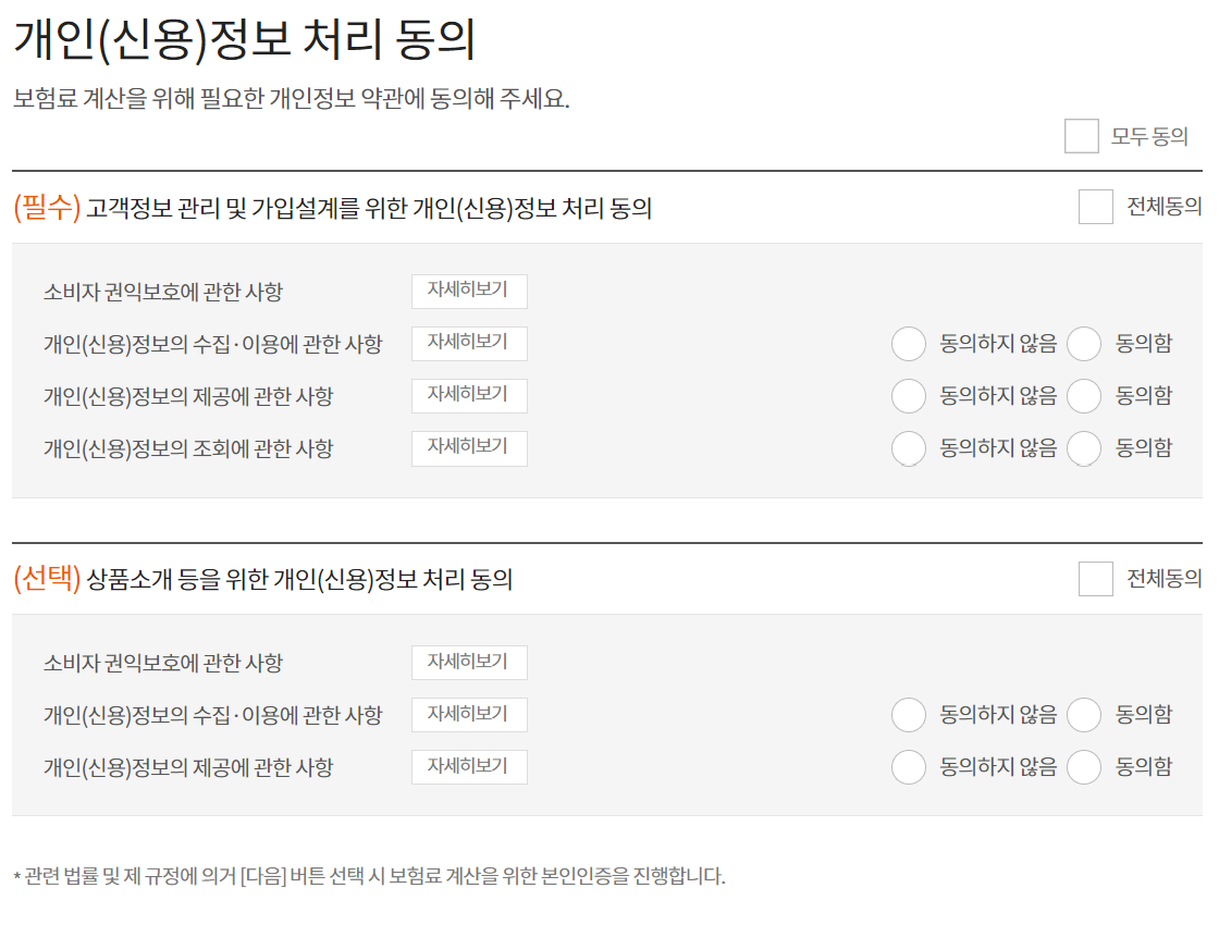 보험료 계산을 위한 개인정보 처리 동의하시고, 선택 사항은 미동의 하셔도 됩니다.