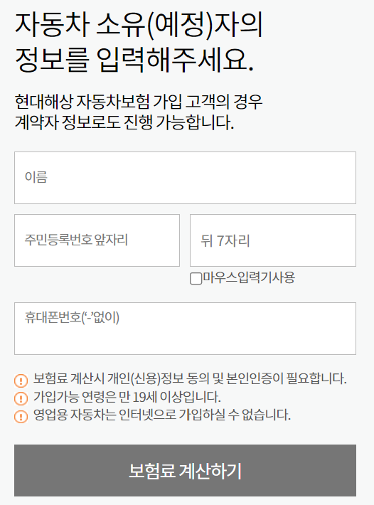먼저 이름, 주민번호, 휴대폰 번호 입력 후 보험료 계산하기 클릭합니다.