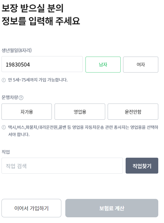 생년월일, 성별, 차량 운행 정보, 직업 정보 입력 후 보험료 계산을 클릭하면 다음과 같이 보험료가 계산됩니다.