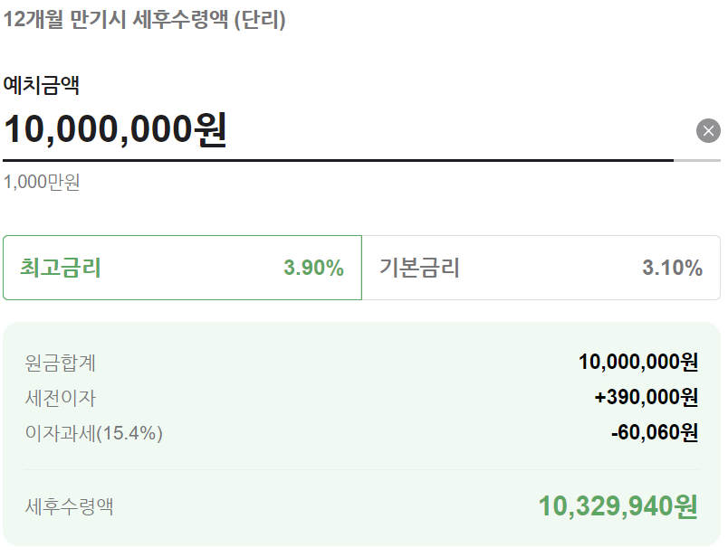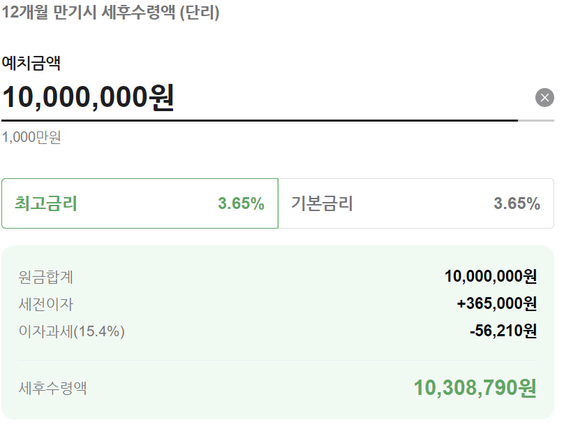 아래는 가입금액 1천만원 가입기간 12개월 만기 시 이자소득세를 제외한 예상 실수령액은 아래와 같습니다.
