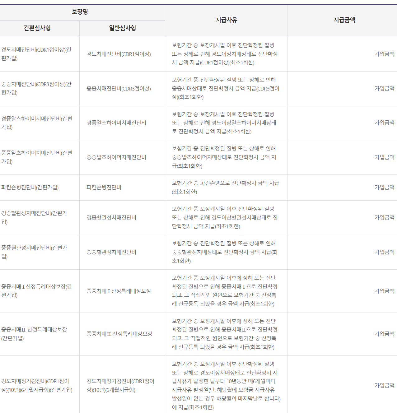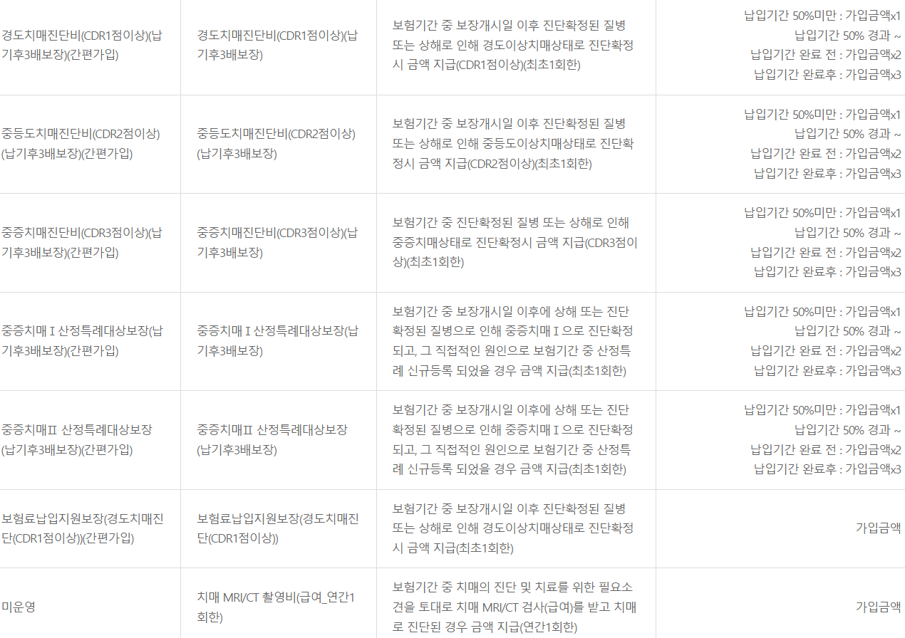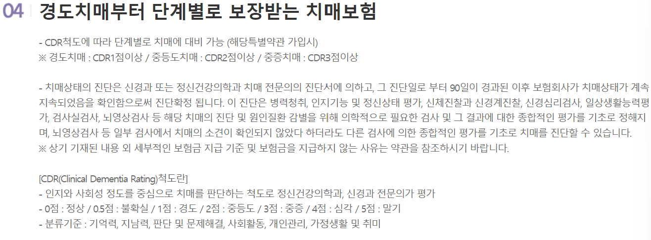 주3) 보험기간 중 각각의 보장개시일 이후에 진단확정된 질병 또는 상해로 인하여 치매상태로 진단확정시 보험금을 지급합니다. 치매상태란 CDR척도점수 1~3점 이상의 인지기능의 장애가 발생한 경우로서 발생시점부터 90일 이상 계속되어 장래에 더 이상 호전을 기대할 수 없는 상태를 말합니다. 치매상태의 진단은 신경과 또는 정신건강의학과 치매 전문의의 진단서에 의하고, 그 진단일로 부터 90일이 경과된 이후 보험회사가 치매상태가 계속 지속되었음을 확인함으로써 진단확정 됩니다. 이 진단은 병력청취, 인지기능 및 정신상태 평가, 신체진찰과 신경계진찰, 신경심리검사, 일상생활능력평가, 검사실검사, 뇌영상검사 등 해당 치매의 진단 및 원인질환 감별을 위해 의학적으로 필요한 검사 및 그 결과에 대한 종합적인 평가를 기초로 정해지며, 뇌영상검사 등 일부 검사에서 치매의 소견이 확인되지 않았다 하더라도 다른 검사에 의한 종합적인 평가를 기초로 치매를 진단할 수 있습니다.