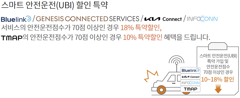 - 커넥티드서비스 가입자 및 TMAP 사용자의 안전운전점수가 70점 이상인 경우 특약할인 혜택을 드립니다.