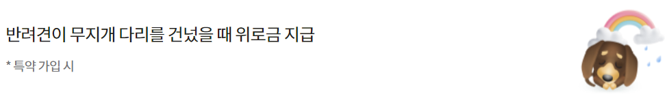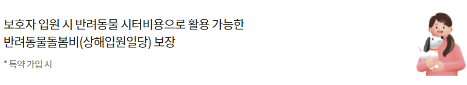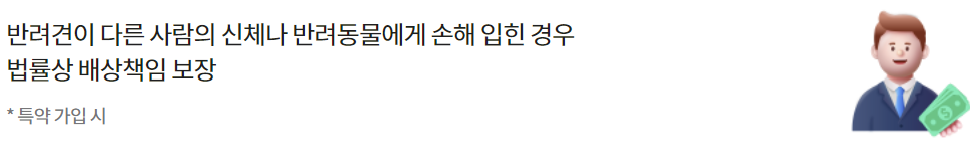 반려견의 행위에 기인하는 우연한 사고로 타인의 신체에 장해를 입히거나 타인 소유의 반려동물에 손해를 입혀 법률상의 배상책임을 부담하는 경우 1천만원 한도 실손보상(자기부담금 : 1사고당 3만원)