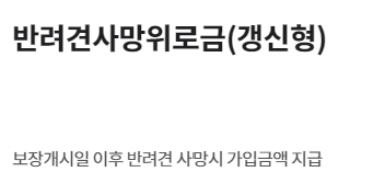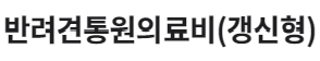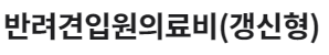 보장개시일 이후 반려견이 상해 및 질병이 발생하여 그 치료를 직접적인 목적으로 입원을 동반하는 치료를 받은 경우 자기부담금을 차감한 후, 보상비율(50%,70%,80% 또는 90%)을 곱한 금액 (단,보상한도내 지급) - 일반형 : 1일당 15만원(수술 200만원), 자기부담금(1일당 1/3만원 택1), 연간 총 보상한도 1,000만원 - 고보장형 : 1일당 30만원(수술 250만원),자기부담금(1일당 1/3/5만원 택1), 연간 총 보상한도 1,000만원