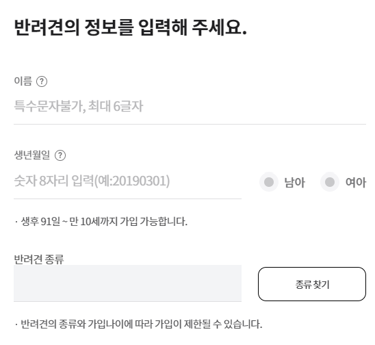 우선 반려견의 이름, 생년월일, 성별, 종류를 입력합니다.