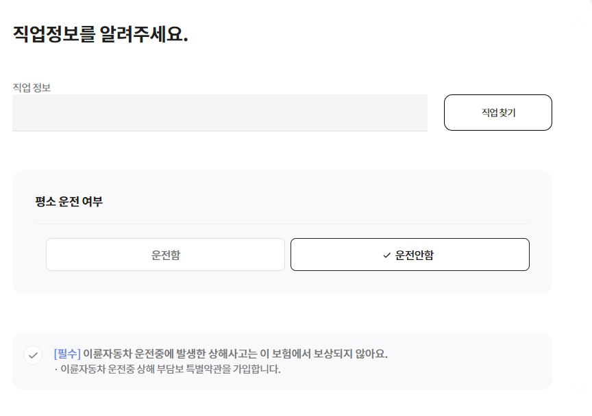 직업정보 및 운전여부를 입력합니다. 그럼 바로 다음과 같이 보험료가 계산됩니다.