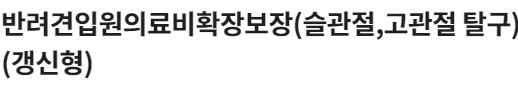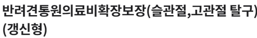 보장개시일 이후 반려견이 슬관절,고관절질환이 발생하여 그 치료를 직접적인 목적으로 입원을 동반한 치료를 받은 경우 보상유형에 따른 자기부담금을 차감한 후, 보험증권에 기재된 보상비율(50%,70%,80% 또는 90%)을 곱한 금액 지급 (단, 해당 특약에서 지급되는 보험금은 반려견의료비(갱신형)보장 및 반려견통원의료비확장보장(슬관절,고관절 탈구)(갱신형)보장과 합산하여 보상한도내 지급)