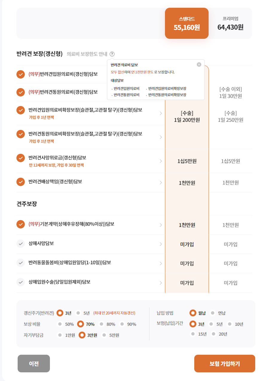 보험료는 갱신주기, 자기부담금 설정, 납입방법, 보험기간, 강아지 종류 , 플랜 등 여러 조건에 따라 달라지므로 직접 조회해보시고 비교를 해보시기 바랍니다.