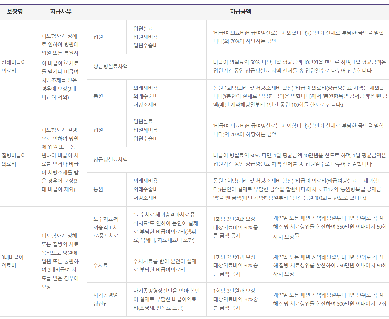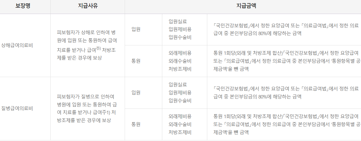 - 주1) 신규가입시 피보험자의 가입나이 및 건강상태, 직업 또는 직무 등에 따라 회사가 정하는 기준에 의해 보험가입금액이 제한되거나 가입이 불가능할 수 있음