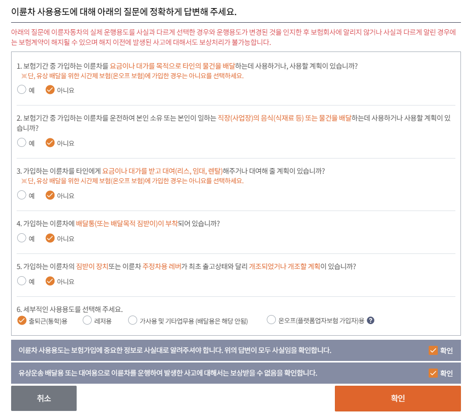 이륜차 정보를 입력합니다. 특히 아래 사용 용도는 정확하게 답변해야 불이익을 받지 않습니다.