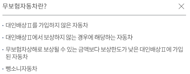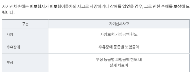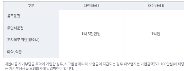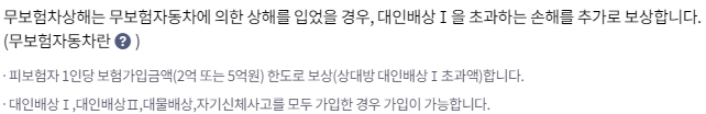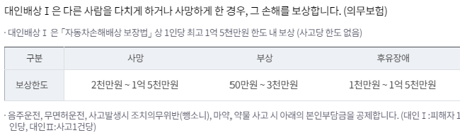 보장내용은 위와 같이 다양하게 있으며, 위 보장 중 필수 의무 가입은 대인배상I, 대물배상이 의무가입대상입니다.
