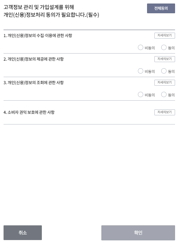 먼저 이름, 주민번호 입력 후 필수 정보 동의가 필요합니다.