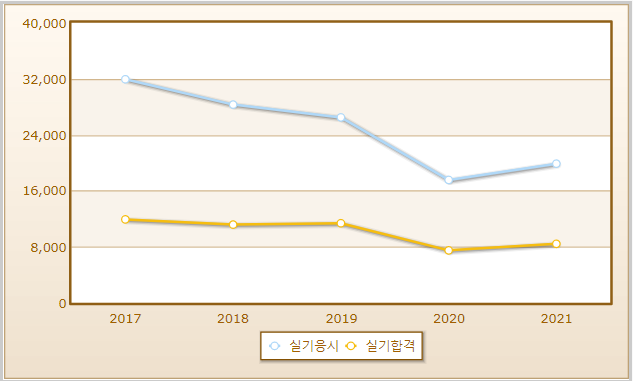 실기시험의 경우 2021년도를 기준으로 하여 19,869명이 응시를 했고 8,418명이 합격했음을 알수 있습니다.