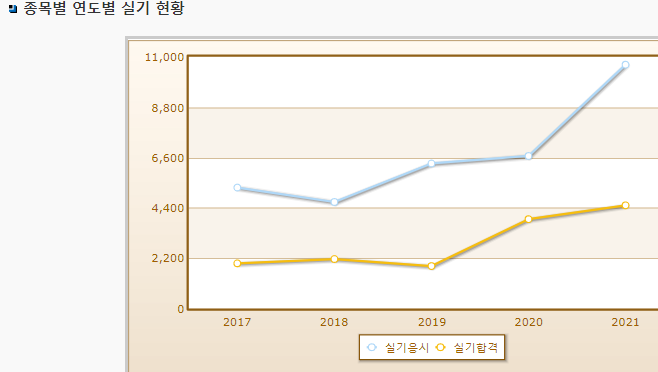 실기시험 연도별 합격률이며, 2021년 기준 실기시험 응시자 수는 10,658명으로 그 중 합격자는 4,508명입니다.