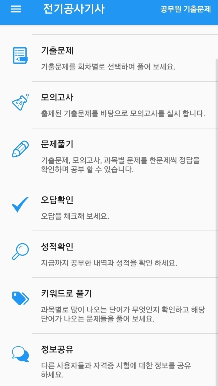 자격증 및 공무원 시험 공부를 할수 있는 기출문제앱 입니다!! 100종목 이상의 자격증 기출문제와 2007년부터 2018년 상반기까지의 공무원 시험 기출문제를 풀어 볼 수 있습니다. 1. 기출문제 기