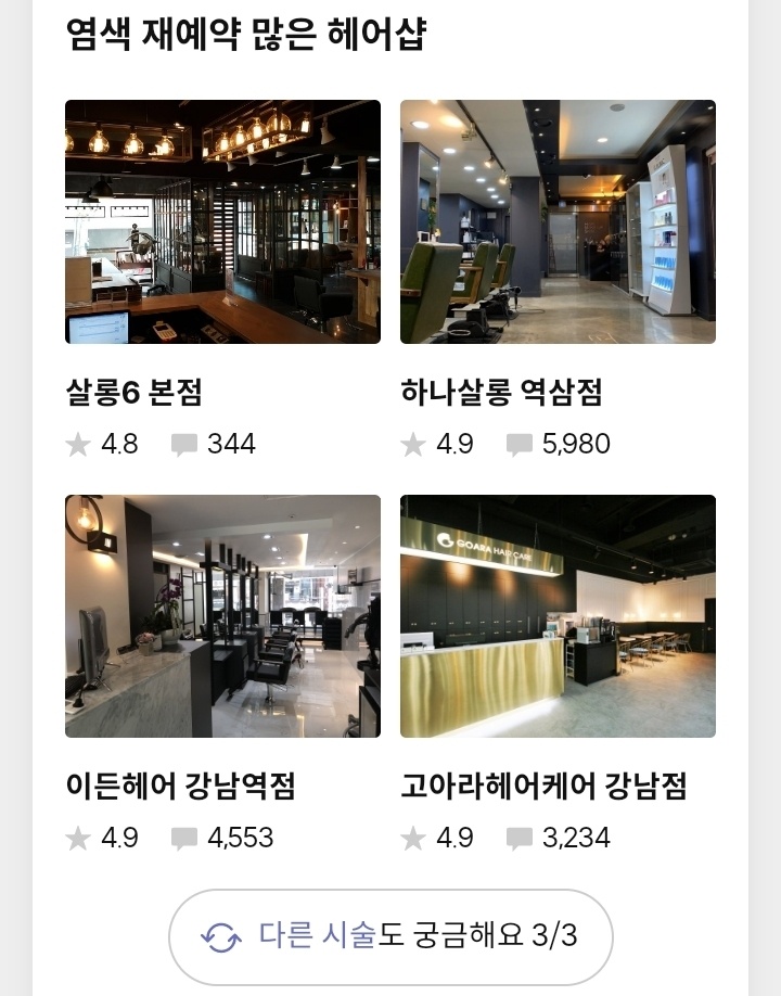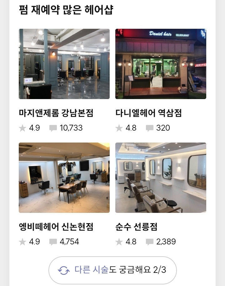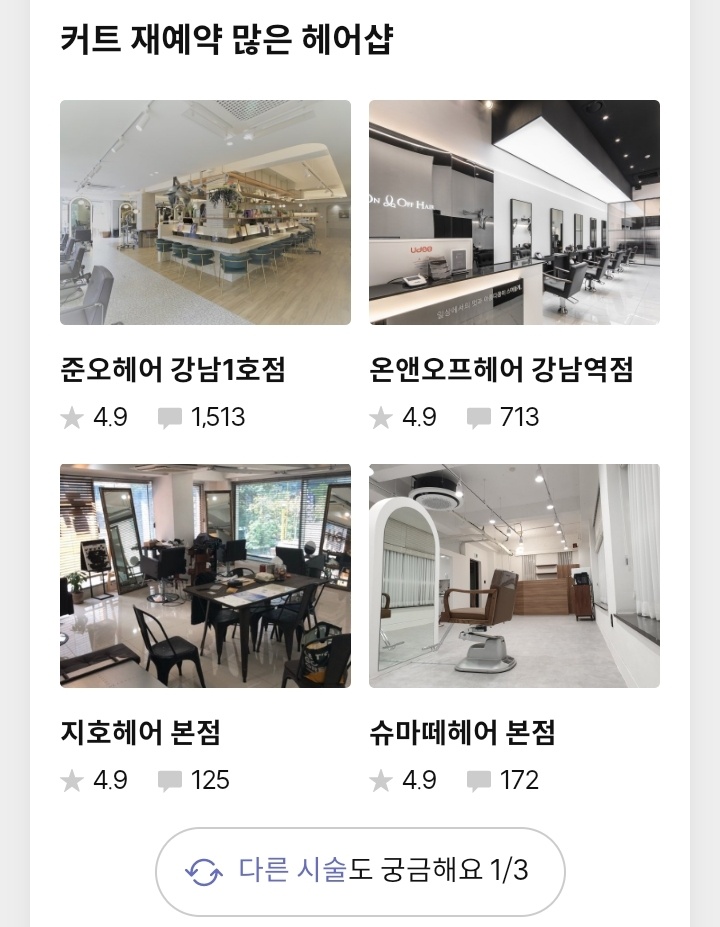 위와 같이 커트, 펌, 염색 등 재예약을 많이한 헤어샵 순위를 보여주고 그 밑에 리뷰는 무지하게 많습니다.