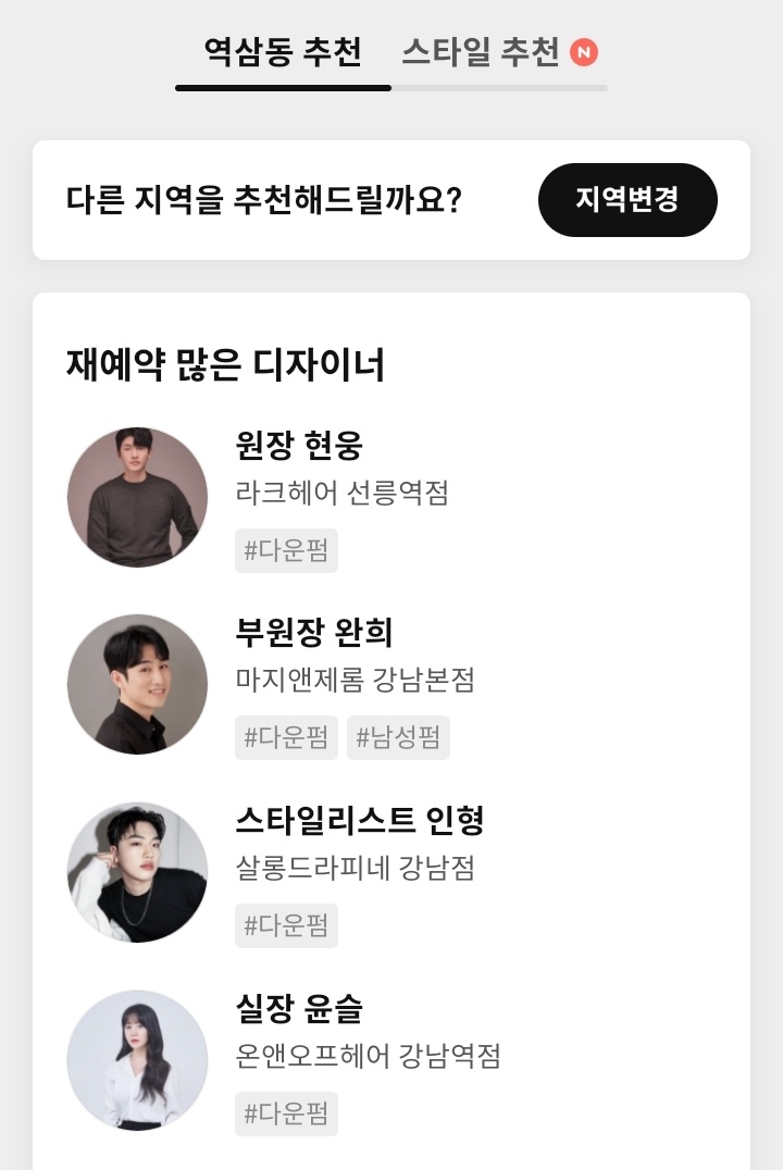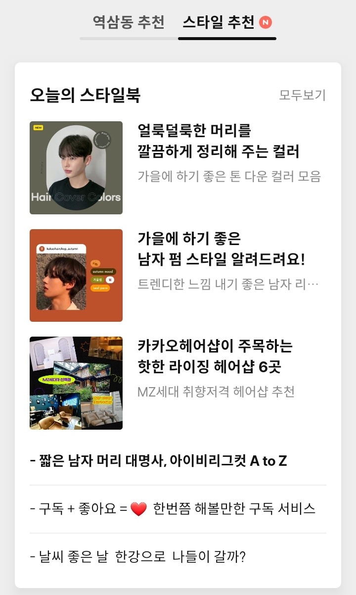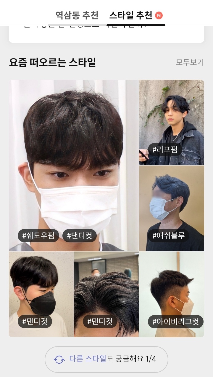 역삼동 추천부터 스타일추천을 눌러보면 요즘 유행하는 스타일 추천, 요즘 뜨는 헤어스타일 등을 볼 수 있습니다.