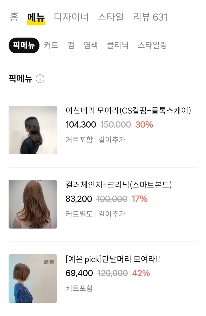 이렇게 미용실 하나를 검색하면 실제 이용자들의 리뷰와 가격을 볼 수 있는 메뉴판도 있고 어떤 헤어스타일이 있는지 , 미용실 픽메뉴는 어떤건지 투명하게 나와있습니다.