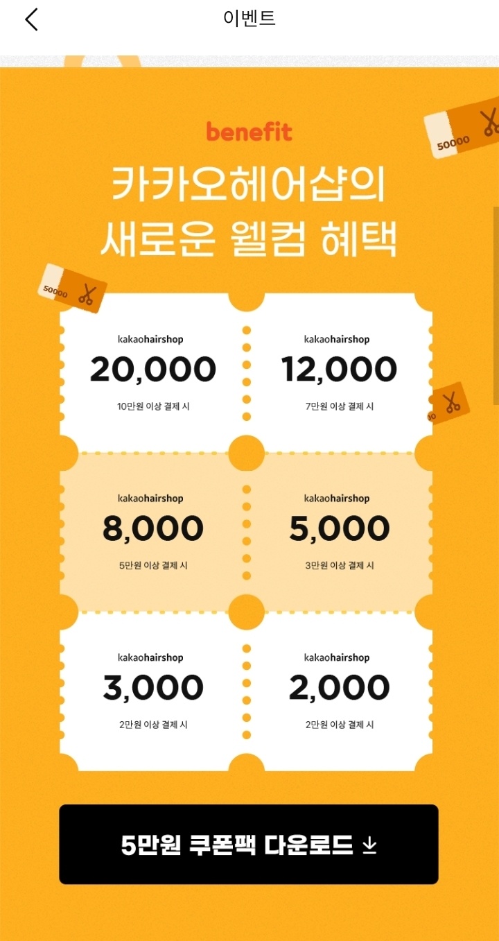 처음 로그인을 하게되면 웰컴 선물이라고 5만원을 주는데 아래와 같이 얼마 이상 사용시 쿠폰혜택을 줍니다.