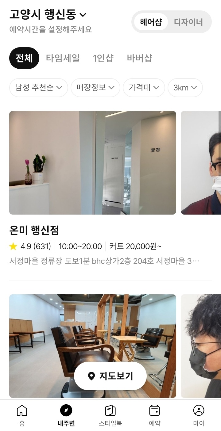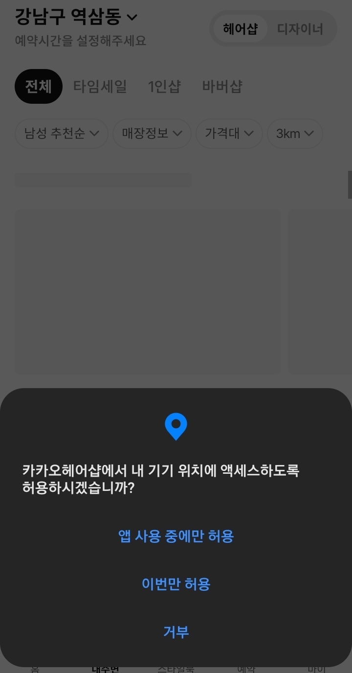 예약하기를 누르면 처음에는 강남구 역삼동만 뜨게 되는데 위치 기반 허용을 해주면 내 주변에 있는 카카오헤어샵을 보여줍니다.