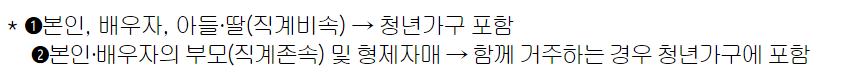 청년가구는 청년 본인과 배우자, 자녀를 말하며, 본인과 배우자의 부모,형제자매 등 다른 가족이 청년과 함께 거주하는 경우에는 해당 가족도 청년가구에 포함됩니다.